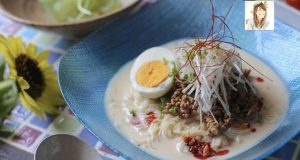 地物でつくる、みえごはん!蒟蒻 香肌麺のバターナッツ豆乳冷やし担々麺