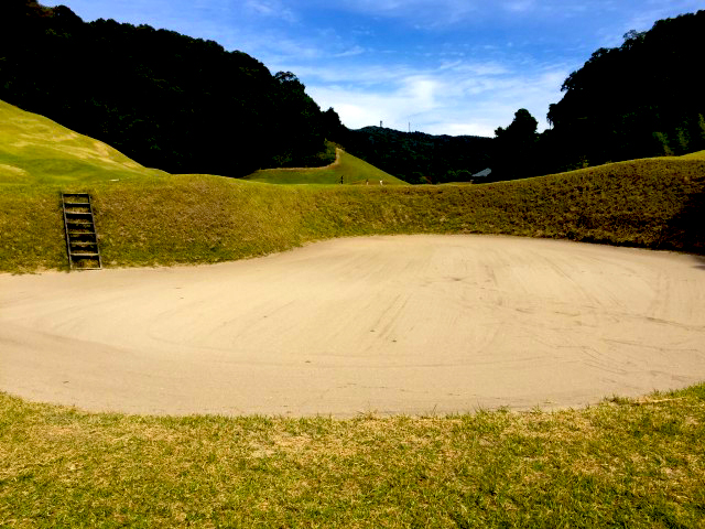 案の定、何度かバンカーに入れてしまい、ひどい所では出すのに3打かかりました…。だって、グリーン手前のガードバンカーなんて高いとこでは2.5〜3mはありますから…。
