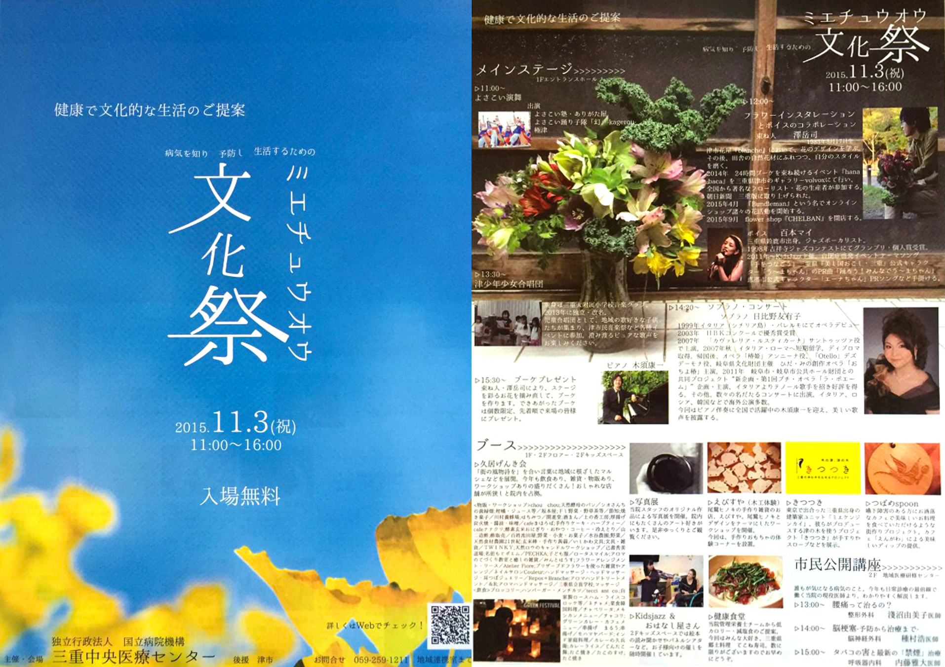 ミエチュウオウ文化祭 日時:2015年11月3日(火)10:00~16:00 会場:三重中央医療センター 住所:三重県津市久居明神町2158-5 お問い合わせ:059-259-1211(地域連携室)