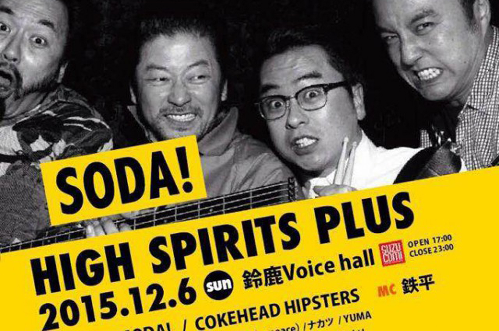 High Spirits PLUS 日程:2015.12.6(sun) 時間:open17:00~close23:00 会場:鈴鹿Voice hall 【 GUEST LIVE 】SODA! COKEHEAD HIPSTERS 【 DJ 】山本アツシ / 前山敏明 / juNk! / taku(Smile for peace)/ナカツ/YUMA 【 VJ 】 kenta morigami 【 Movie 】 Ⅱ-TwinTowers- 【 Photo 】 オモタニカオリ 【 Food 】カフェコブ/ mooncafe/jamise 【 Shop 】 TOWER RECORDS ADV:3,500YEN / DOOR:4,000YEN e+ イープラス [ PC・携帯 http://eplus.jp ] ※ファミリーマートにて直接購入もできます。 チケット取り扱い店または、メールにて枚数をお伝えください mall:hs@highspirits.jp