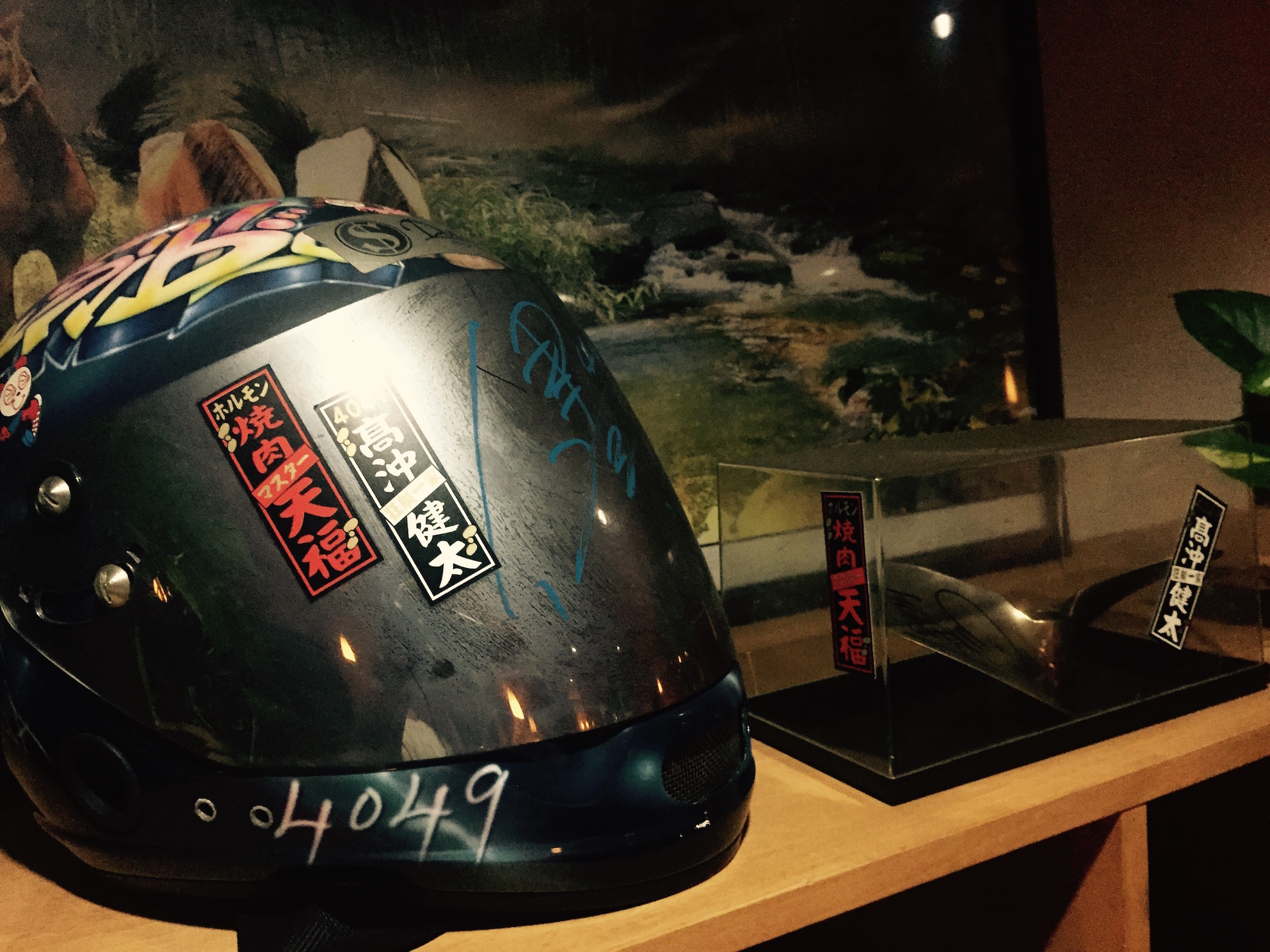 店内にはサインはもちろん、ヘルメットやペラが飾られています。