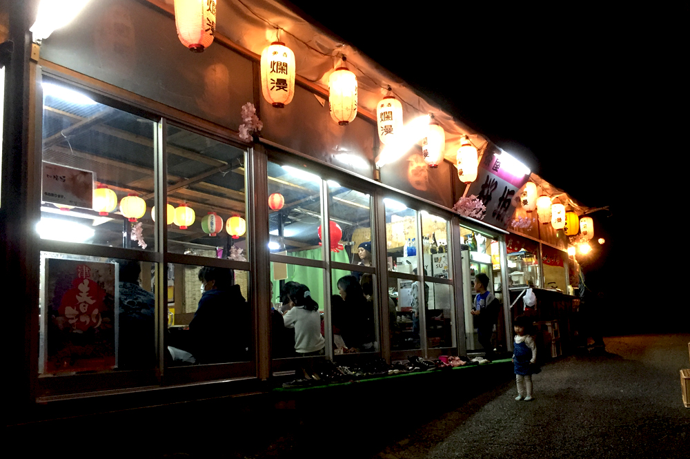 店内はこんな感じ。毎年花見シーズンが終わると店ごと撤収して、シーズンが来ると建てるので、即席居酒屋といった感じです。しかーし…