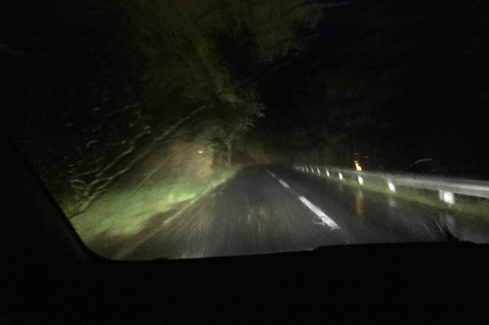 しかし、ナビに従って進んでいるのだが、進めば進むほど、車一台通るのがやっとの道に入り込んでいく。もちろん街灯などない。