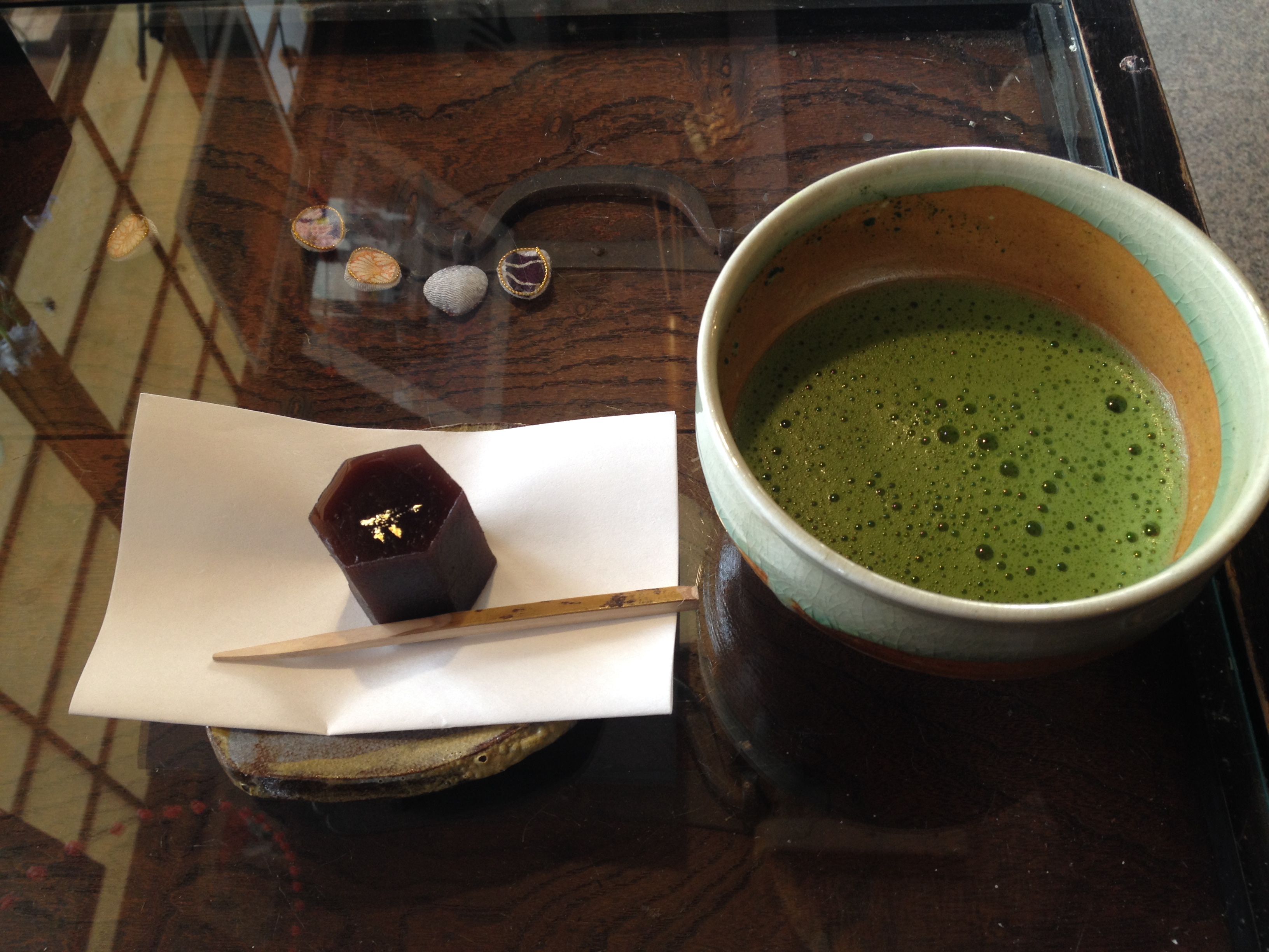 「岩戸の塩ようかん」を抹茶とともにいただきましょう!美味しそうでとても絵になります。ググッと竹串に力を入れてやっと切れるしっかりした羊羹、口に含めば塩の味のしょっぱさと小豆の優しい甘さにうっとり。抹茶との相性も抜群!店主曰く、焼酎や日本酒、コーヒーにも良く合うとのこと。