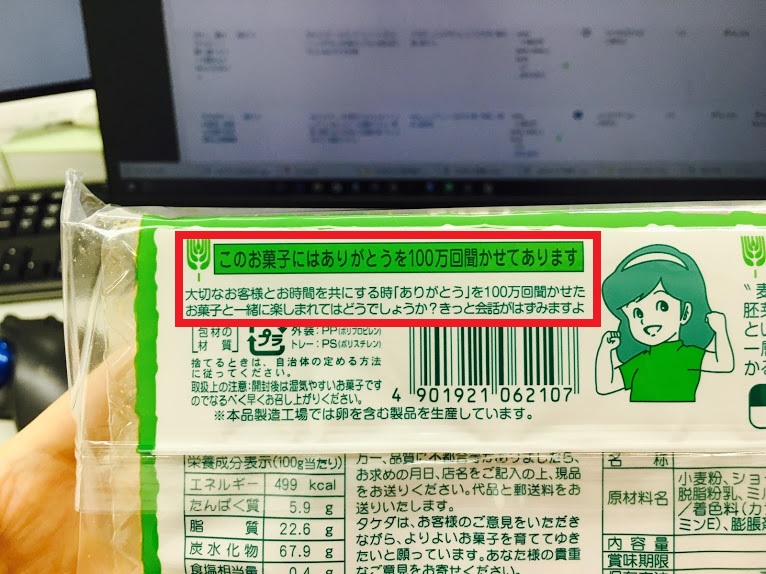 『このお菓子にはありがとうを100万回聞かせてあります』