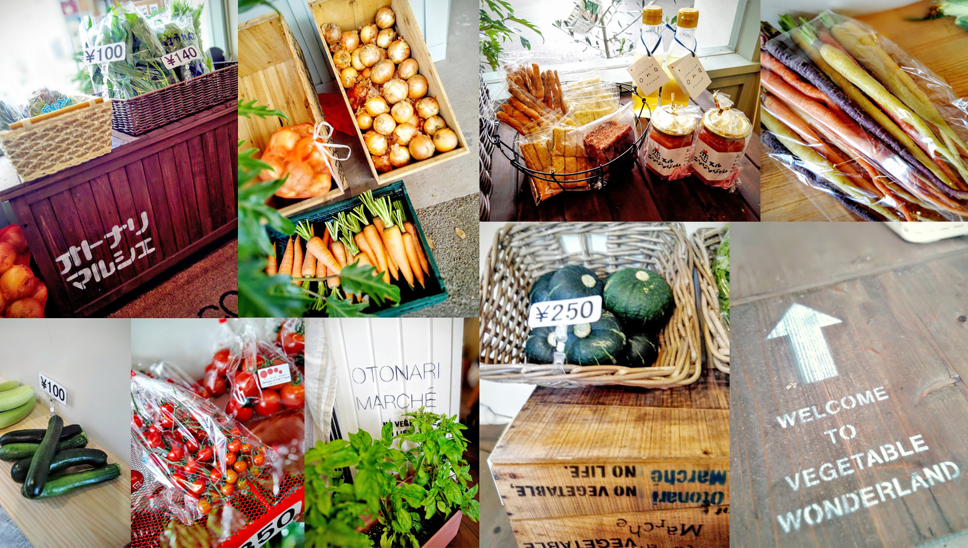7月11日にオープンしたばかりの「オトナリマルシェ」。ステンシルが施された木箱に野菜がゴロっと入れてあって、おしゃれ!!八百屋じゃなくて「マルシェだ!」と入る前からテンションがあがります。