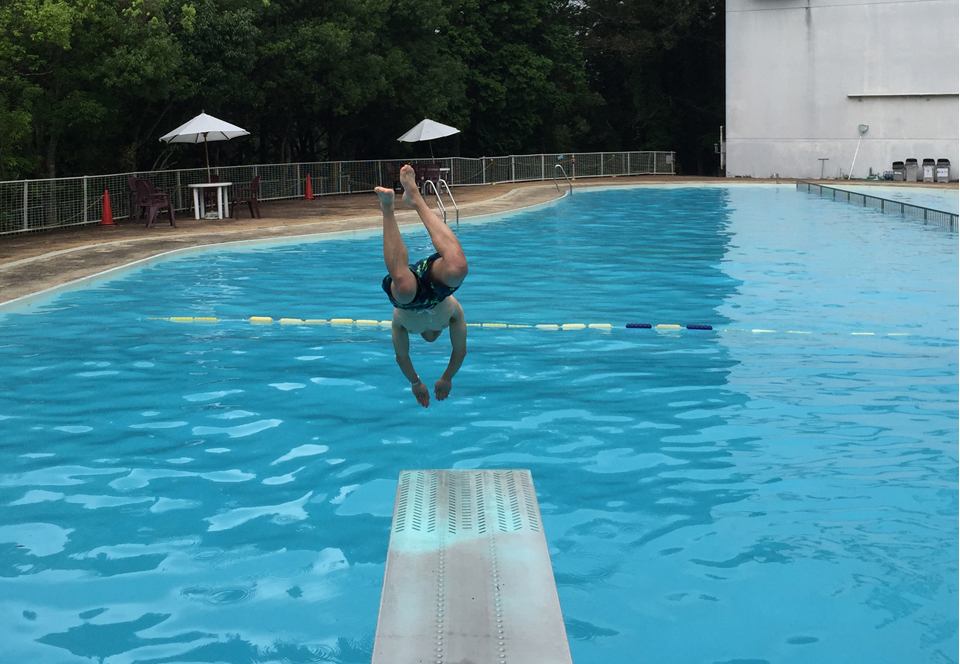 ジャンプ台があるプール。最初はオーソドックスに飛び込むのですが、だんだん前中返りに挑戦したり、バックで飛び込んだり、どうも飛び込み台はオトコのコドモ心を刺激するようです。