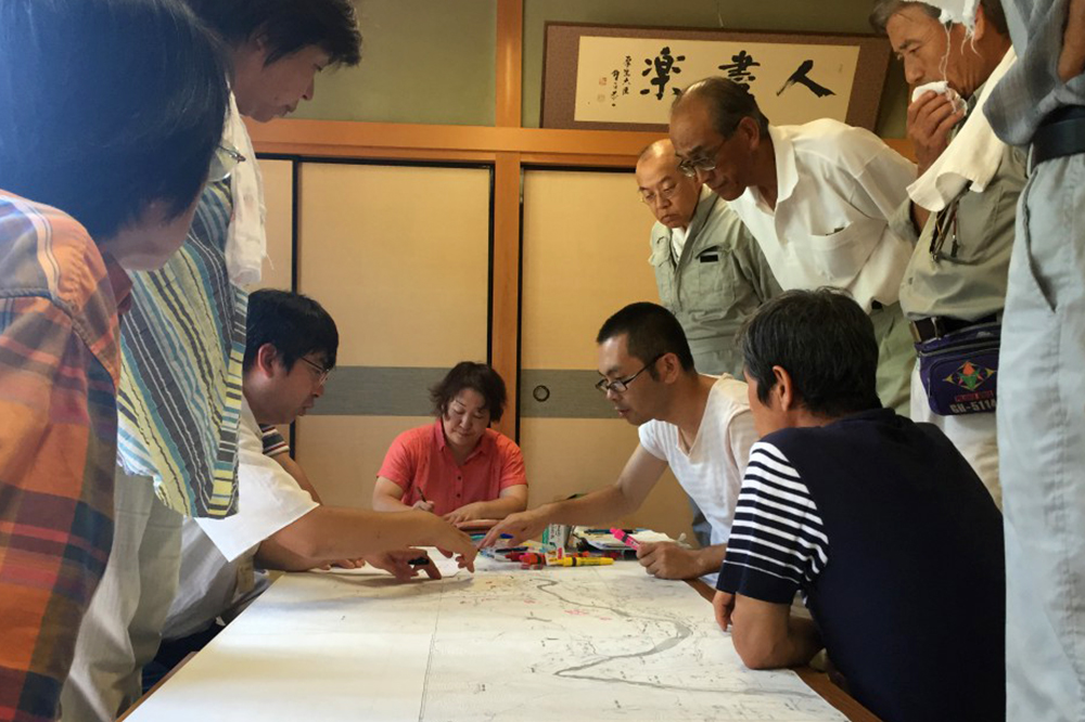 コーディネーターさんを中心に地図に回った所を書き込んだり、付箋を貼って情報を共有したりします。