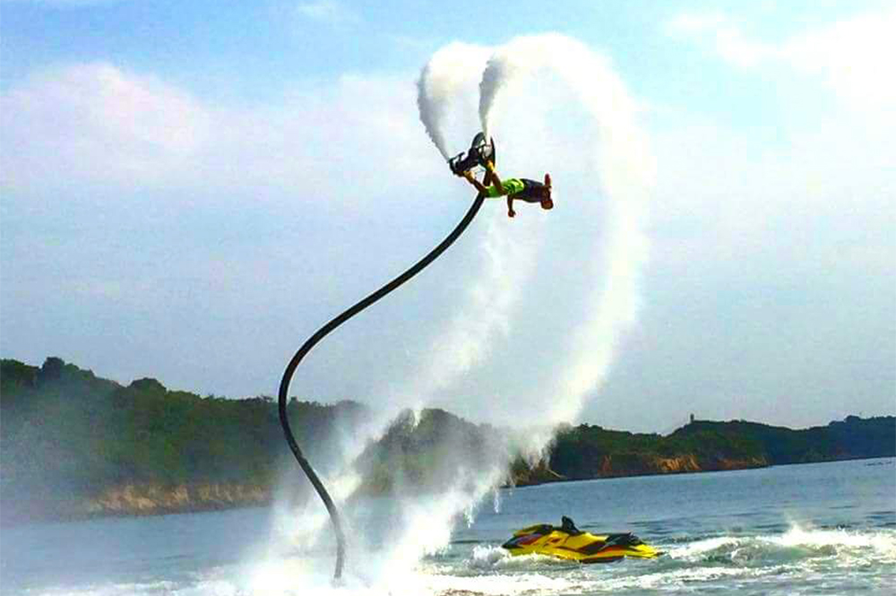 フライボード は、水上バイクから噴出された水を利用して、水圧の力で空を飛ぶことができる装置を装着して空中を自由に飛ぶことができます。テレビやCMで話題が沸騰し、近年人気が高まっています。フライボード は見た目上、難易度が高く初心者には難しいのではないかと考える方もいるかもしれませんが、10分から15分程度で飛ぶことができるため、どなたでも安心して体験することができます。上達するとイルカのように、自由自在に泳ぐこともできます。これから大注目のレジャー。