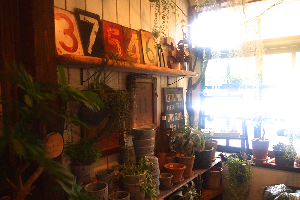 多肉植物やエアプランツなどのグリーンの他にも、雑貨店ならではのガーデニング用品、アンティークの家具、外国製のラベル、照明器具、食器、小物などが所狭しと並べられている。