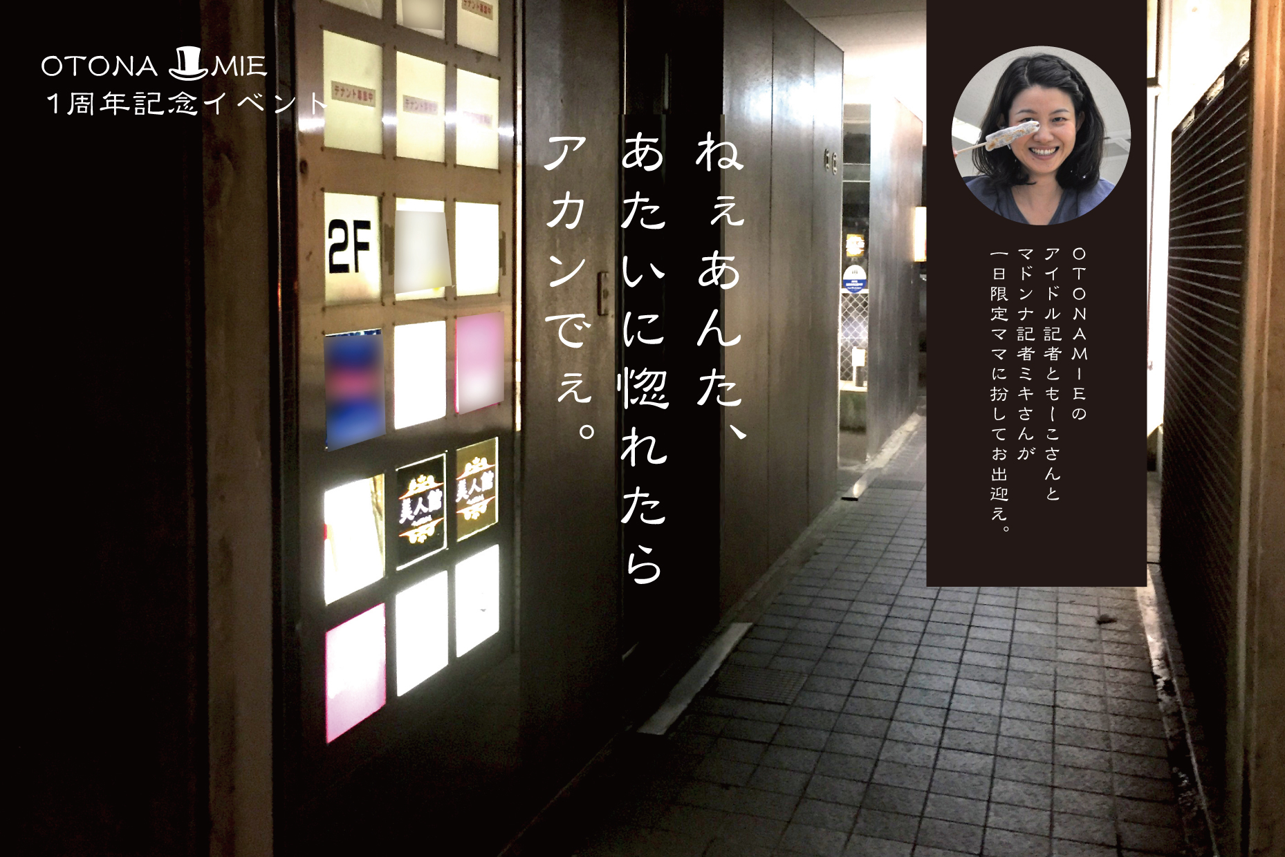 そこで今回、1周年記念イベントとしてOTONAMIEのアイドル、ともーこ記者と、OTONAMIEのマドンナ、福田ミキレギュラー記者が一日限定ママに扮し、「スナックオトナミエ」を開催します!