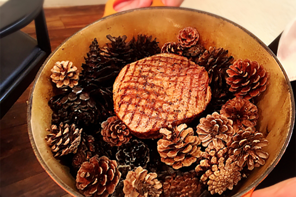 八阪神社などの松ぼっくりとハーブでお肉を燻しています。