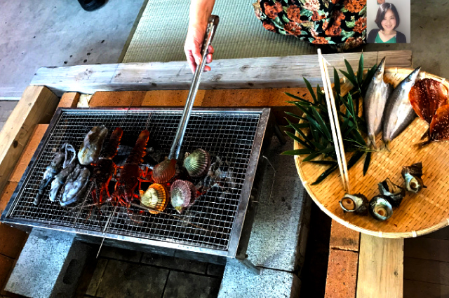 この絶好のロケーション、海女小屋風の建物の中でいただく 志摩の食材を使ったお料理と海鮮バーベキュー!