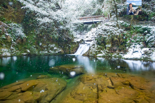 雪景色から流れおちる滝にザーッと叩きつけられる水の音。最高の癒しの空間です。