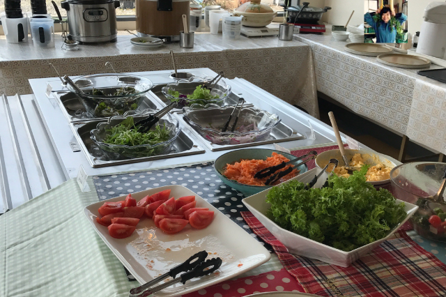 みどりの大地の店頭に並ぶ旬の野菜をふんだんに使った日替わりランチが楽しめる。