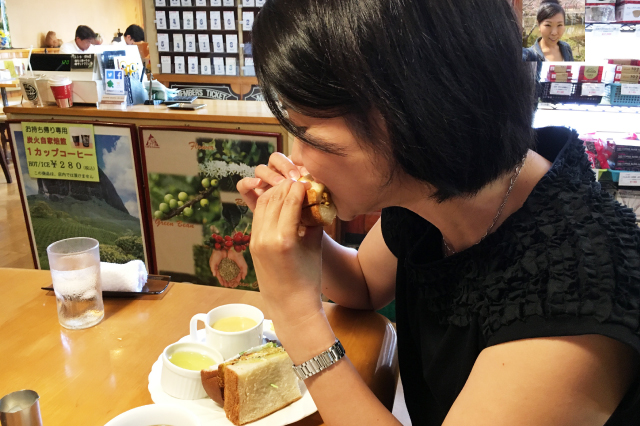 岡田:「ともーこさん。これが噂の小女子サンドウィッチです!パクリといっちゃって下さい!」