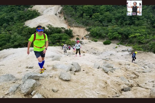 所々急斜面では、ロープを伝って一人ずつ上へ。