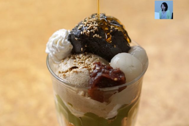 ~お好みのごまアイスとなめらか抹茶プリンや白玉、ふんわりホイップクリームで、和の香りただようパフェに。