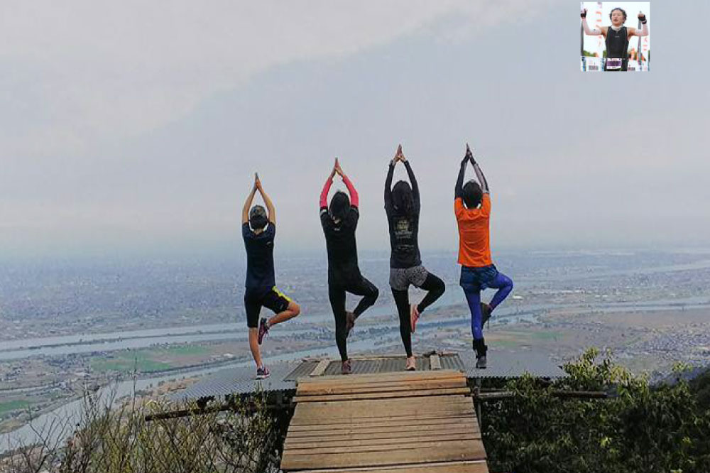 そしてやっとパラグライダー発射場到着。ゆっくりペースでスタートして2時間15分でした。ちなみに春休み中ですので中学生のお子さんも一緒に走ってくれました。発射場でヨガってみました。
