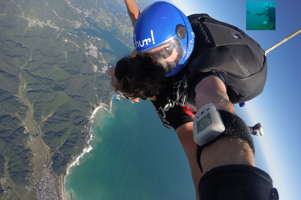ヘリから飛び降りフリーホールの時間が約30秒間で時速は何と250km!パラシュートを開いてから3分から4分くらいで海岸に戻ってくるそうです。