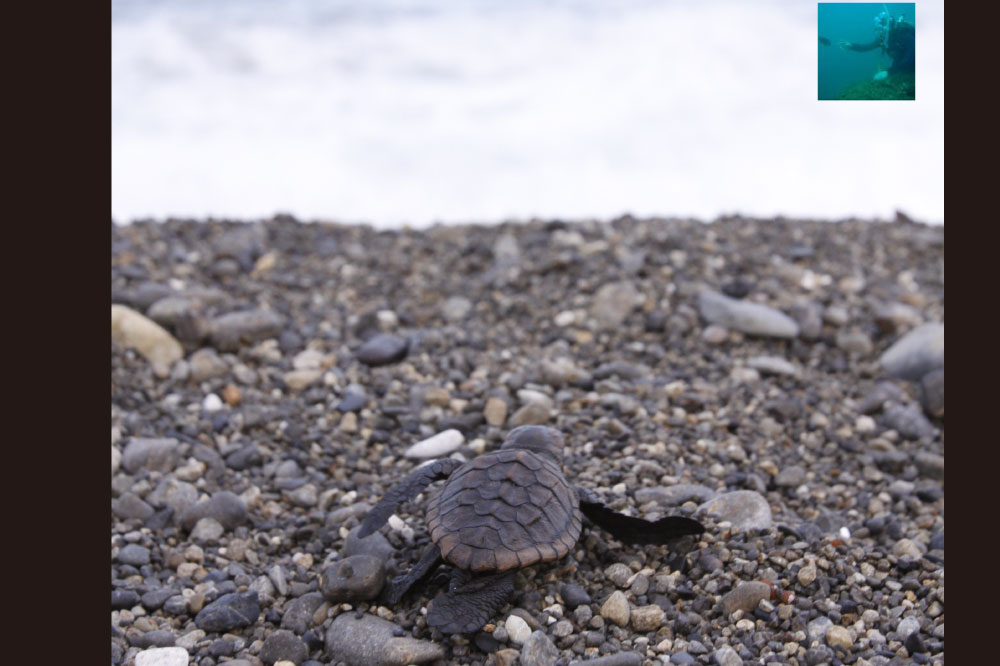 孵化した子ガメの旅立ち。これから黒潮に乗り、食べ物が豊富な遠く離れたカリフォルニア半島の沖合に向かう。