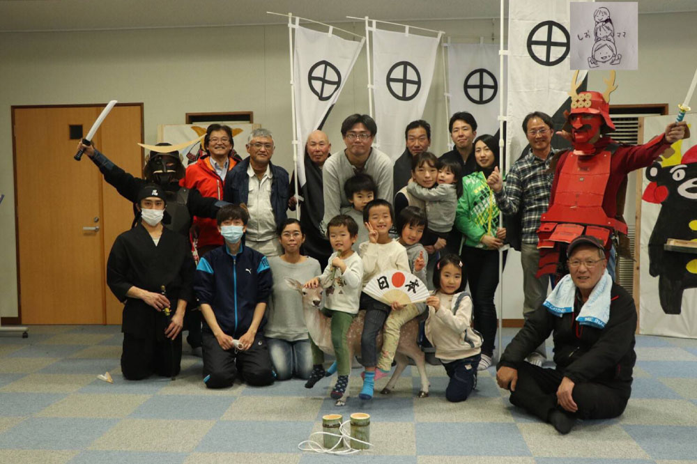ダンボール甲冑に身を包んだ武将に向けるこども達・・・