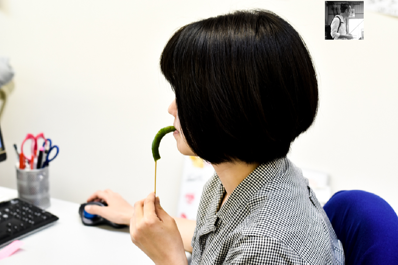 お仕事中のOTONAMIE広報、ともーこさんにも棒に刺した虎の尾を食べてもらいました。