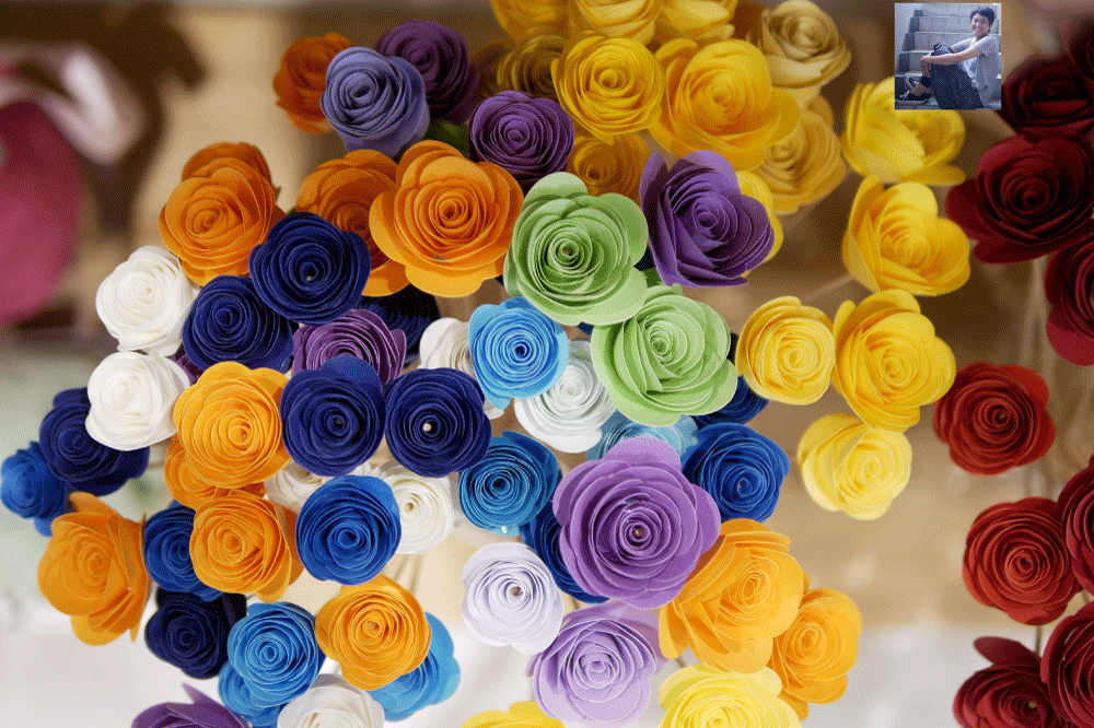 何枚もの折り紙を織り込んで作品を作っているそうです。