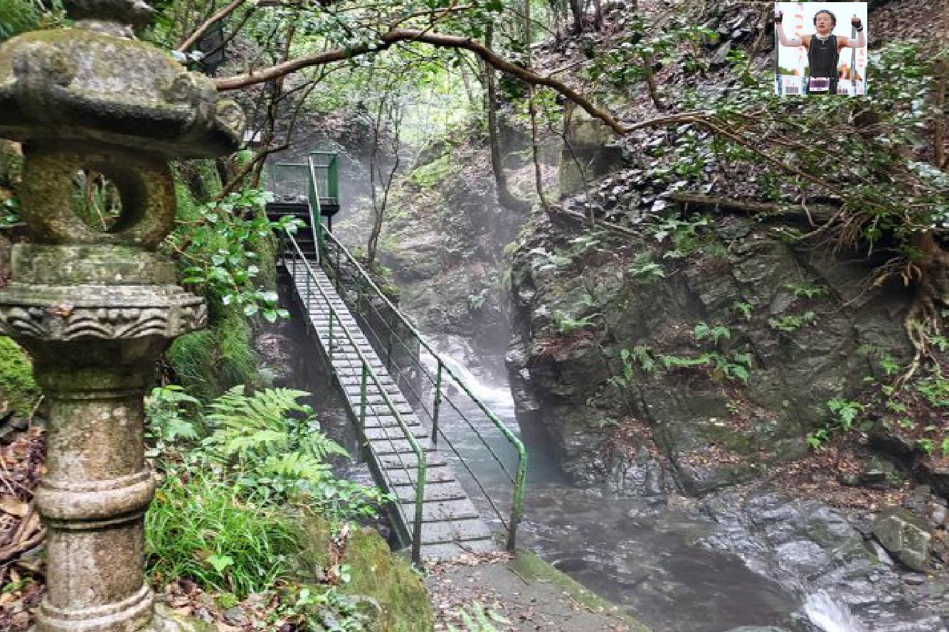 更に奥に、すると未舗装コースに。時々青池神社ののぼりが立っているのでコースが間違いないのが分かってホッとする。そして隣の小川が白く霞んできて体感気温が下がってヒンヤリした頃に・・・