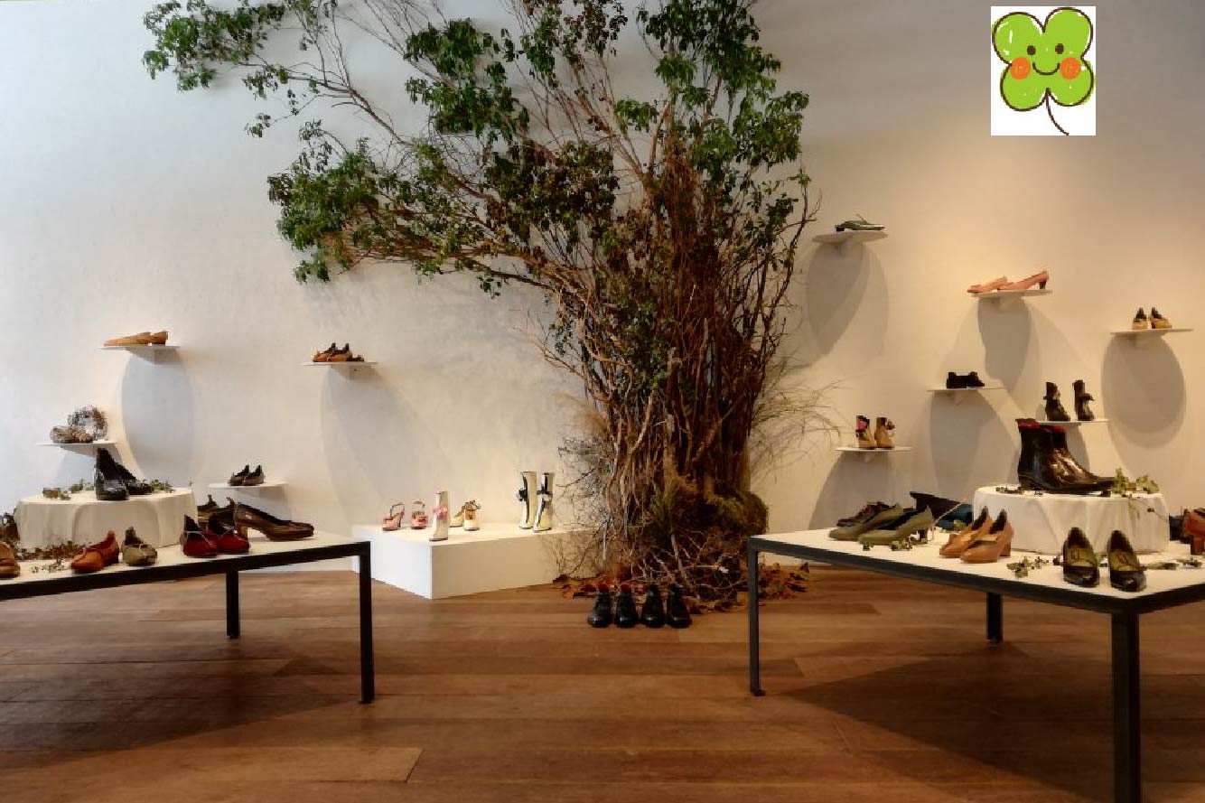 枝から伸びる葉っぱとか、風に吹かれた葉っぱとか花弁をイメージした靴は、アトランダムに壁に展示しています。
