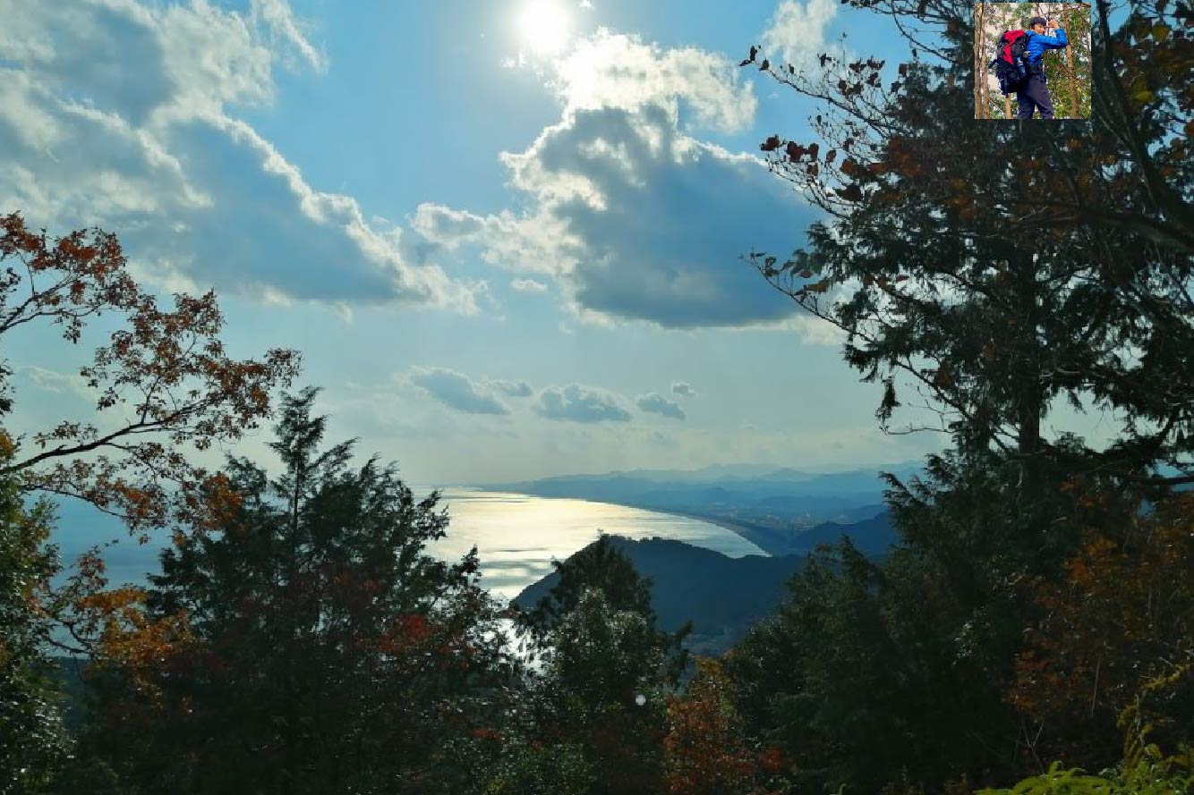 そして、きっと今日一番の見どころ、標高280mから熊野が一望できる見晴台です。西日が熊野灘を照らし、目をすぼめてしまうまぶしさです。ここから熊野を見ると、いかに熊野が陸の孤島かがわかります(笑)