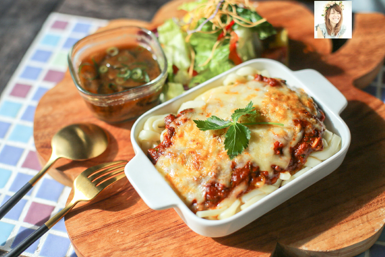 伊勢うどんラザニアには濃い目の味噌スープ付。