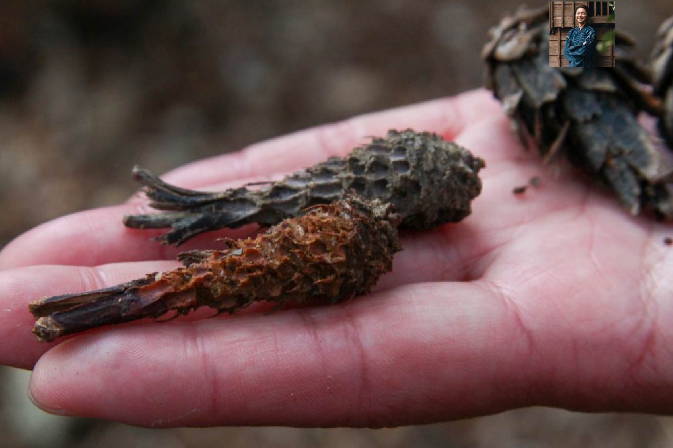 さらに登山ガイドの野田さんが拾い上げたのが、カワイらしい形のあるモノ。通称 エビフライと呼ばれるモノの正体は、松ぼっくりなどの木の実です。