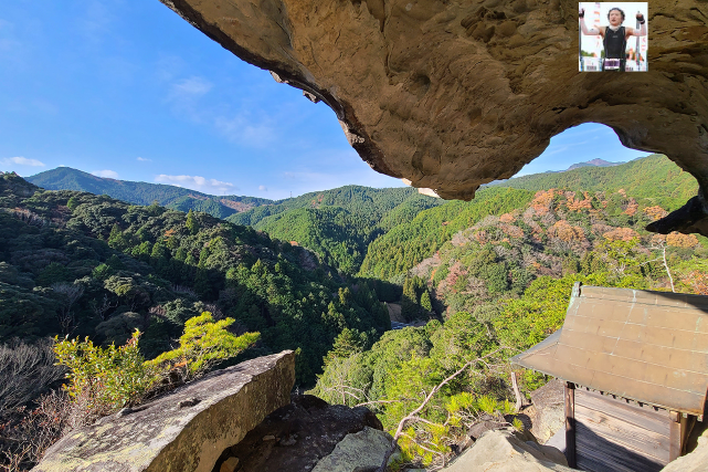 壁を上がった先は見晴らしのよい景色に。行者尊が鎮座してこれからの修行を軽い気持ちで向かうなよと説得している?