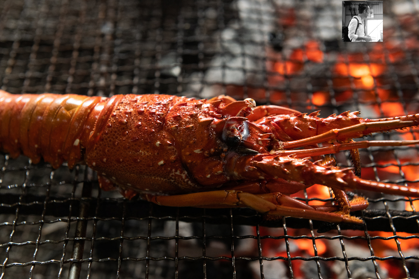 後は丸ごと焼いていくだけ。シンプルな調理法ながら、火を入れることで甘味が増し、伊勢海老の大きな身の食感を贅沢に味わえます。