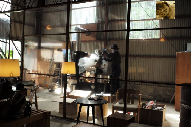 『エジソン休憩所』では、『休憩所』の横の『研究所』に焙煎機が設置され、コーヒーを飲みながらコーヒーの焙煎機が稼働しているのが見える。