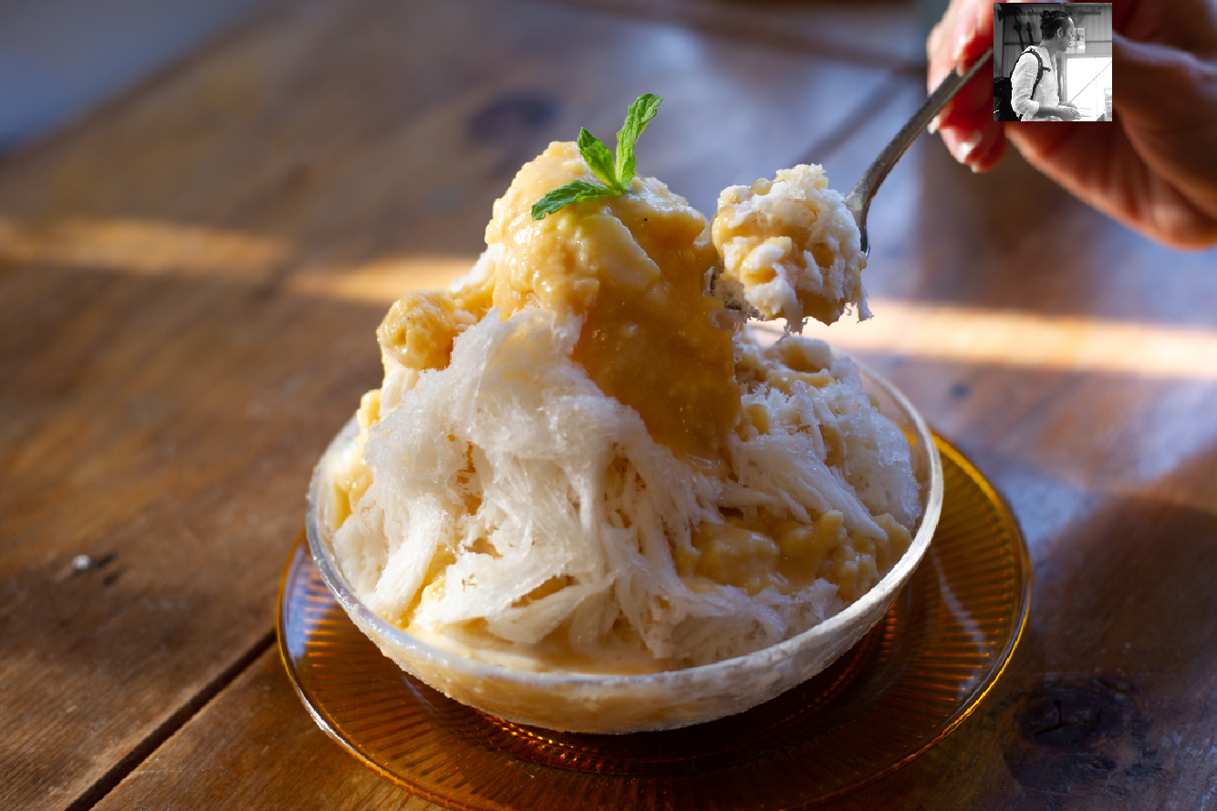 ラテアートやおしゃれなパンケーキ、地元きんこ芋のかき氷もありました。(カメラマンと私のおじさんだけのコンビだとまず食べることはない)。キャッキャと写真を撮影していると、お店の猫や席にやってきて、気が付けば眠っていました。